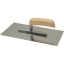 Glättekelle aus gehärtetem und poliertem, rostfreiem Stahl. Stütze aus Leichtmetall und Holzheft. Einfache Ausführung.
